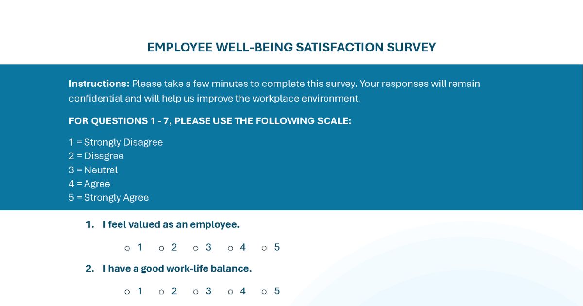 Use this survey template to gather feedback from your employees on the well-being of the organization and the impact of your program.
